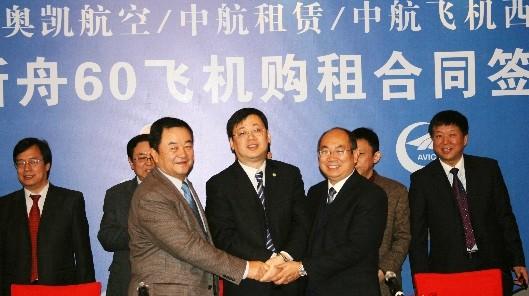 2013年1月18日,奧凱航空與中航國際租賃公司、西安飛機國際航空制造股份有限公司在北京簽署3架新舟60飛機購租合同。奧凱航空總裁劉偉寧;西飛集團(tuán)公司總經(jīng)理、黨委書記、中航飛機西飛黨委書記宋水云;中航租賃總經(jīng)理趙宏偉等領(lǐng)導(dǎo)在購租合同上簽字。