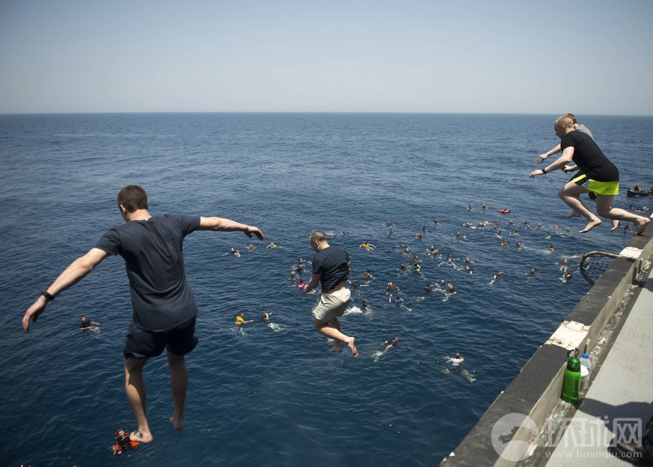 據(jù)美國海軍網(wǎng)報(bào)道,當(dāng)?shù)貢r(shí)間5月12日,正在阿拉伯海北部執(zhí)行部署任務(wù)的美國海軍尼米茲級航空母艦艾森豪威爾號(hào)(CVN 69)組織艦員進(jìn)行跳水游泳訓(xùn)練。這不僅僅是一項(xiàng)休閑娛樂活動(dòng),也是訓(xùn)練艦員在緊急情況下的跳水逃生能力。