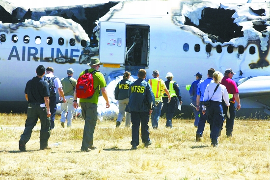 美國國家運輸安全委員會調查人員在事故現場檢查飛機殘骸。