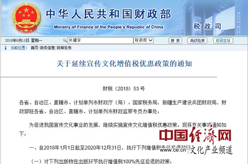經(jīng)濟日報-中國經(jīng)濟網(wǎng)北京6月12日訊 近日,財政部和稅務總局聯(lián)合發(fā)布了關于延續(xù)宣傳文化增值稅優(yōu)惠政策的通知(以下簡稱“通知”)。經(jīng)濟日報-中國經(jīng)濟網(wǎng)記者發(fā)現(xiàn),各類出版物在出版環(huán)節(jié)執(zhí)行增值稅先征后退至少50%。