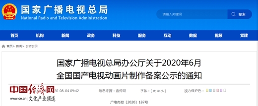 經(jīng)濟日報-中國經(jīng)濟網(wǎng)北京8月5日訊 中國經(jīng)濟網(wǎng)文化產(chǎn)業(yè)頻道記者從國家廣播電視總局官網(wǎng)獲悉,《國家廣播電視總局辦公廳關(guān)于2020年6月全國國產(chǎn)電視動畫片制作備案公示的通知》(簡稱《通知》)于4日發(fā)布?!锻ㄖ访鞔_,2020年6月,經(jīng)備案公示的全國國產(chǎn)電視動畫片為53部,19934分鐘。