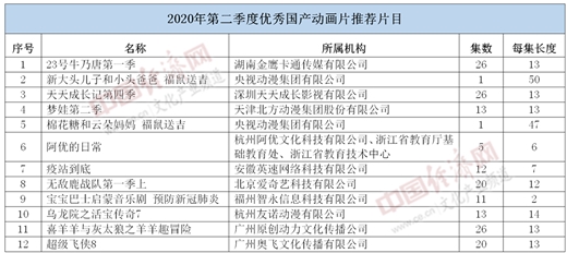 據(jù)經濟日報-中國經濟網(wǎng)記者了解,此次入選的國產動畫片集數(shù)最長26集,最短1集。根據(jù)相關通知,入選2020年第二季度優(yōu)秀國產動畫片推薦片目的12部作品將優(yōu)先安排在全國各級電視臺上星綜合頻道、動畫少兒頻道、地面少兒頻道播出。