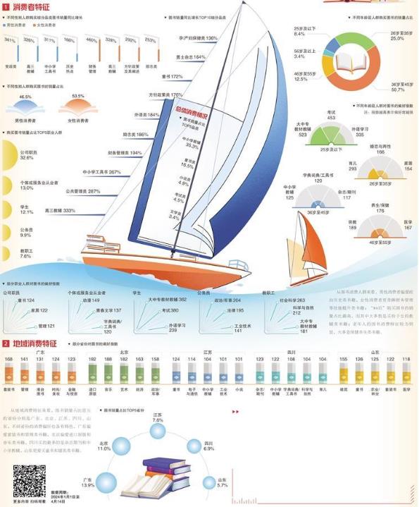 圖書是人們求知的階梯,也是不少人遇到現實問題時,尋找解決途徑的重要選擇。無論是學生、職場人、管理者,還是年輕父母、中老年人,不同的閱讀偏好也體現出生活重心和關注點的區(qū)別。從圖書消費人群來看,“80后”人群購買圖書的銷量占比最高,超過了50%。從圖書銷量及增長的占比情況來看,教輔類圖書最受歡迎,增長勢頭十分強勁。