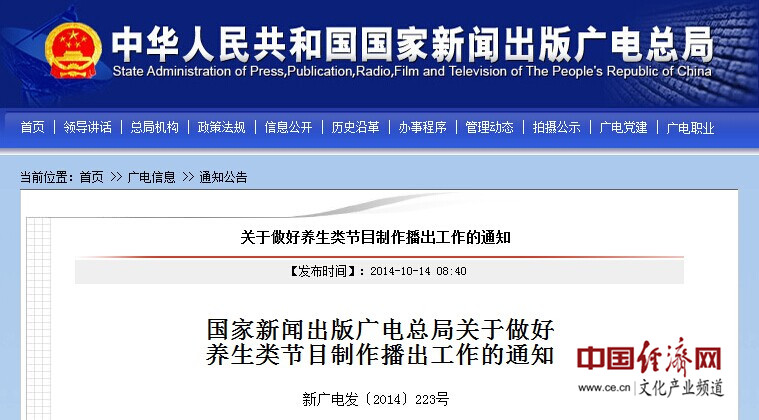 中國經濟網北京10月22日訊 中國經濟網文化產業(yè)頻道記者從國家新聞出版廣電總局網站獲悉,近日,國家新聞出版廣電總局針對養(yǎng)生類節(jié)目存在夸張宣傳、廣告植入等問題下發(fā)通知,規(guī)范養(yǎng)生類節(jié)目播出秩序。通知要求,電視養(yǎng)生類節(jié)目只能由電視臺策劃制作,不得由社會公司制作,并嚴禁以變相形式發(fā)布廣告等。以下為通知全文。