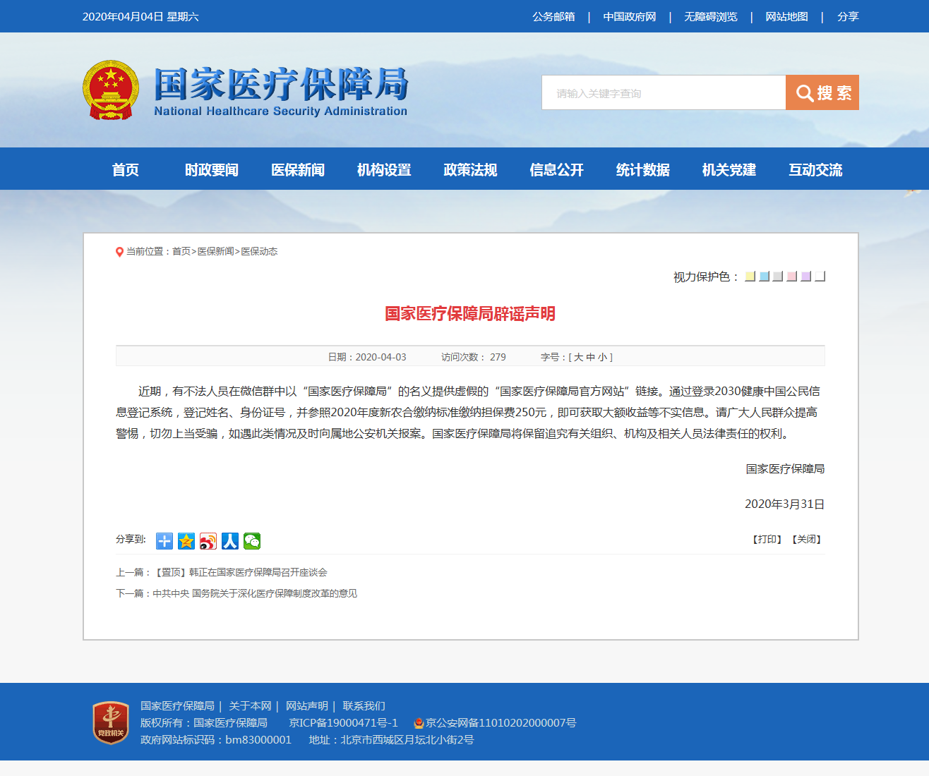 4月3日,國(guó)家醫(yī)療保障局發(fā)布辟謠聲明:請(qǐng)廣大人民群眾提高警惕,切勿上當(dāng)受騙,如遇此類情況及時(shí)向?qū)俚毓矙C(jī)關(guān)報(bào)案。國(guó)家醫(yī)療保障局將保留追究有關(guān)組織、機(jī)構(gòu)及相關(guān)人員法律責(zé)任的權(quán)利。
