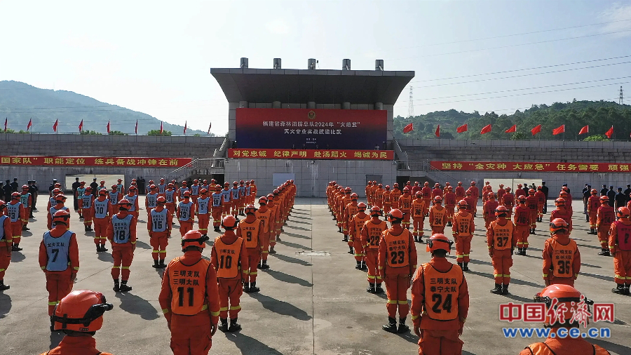 福建省森林消防總隊(duì)2024年“火焰藍(lán)”滅火專業(yè)實(shí)戰(zhàn)技能比武開幕式現(xiàn)場。 蔡增欣/攝