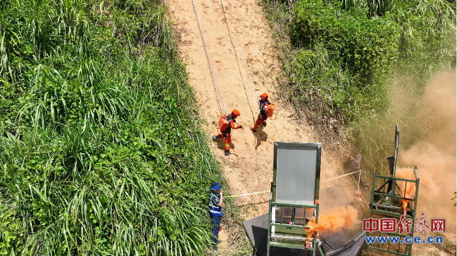 消防員在特殊地形處置煙點(diǎn)。特殊地形煙點(diǎn)處置是指在無法直接接近的陡坡設(shè)置模擬煙點(diǎn)(水袋),要求人員協(xié)同利用繩索技術(shù)安全抵近煙點(diǎn)進(jìn)行處置,以輸水時(shí)間和組織的安全性綜合評定成績,檢驗(yàn)特殊地形條件下滅火、救援技術(shù)結(jié)合運(yùn)用的能力。 李為展/攝
