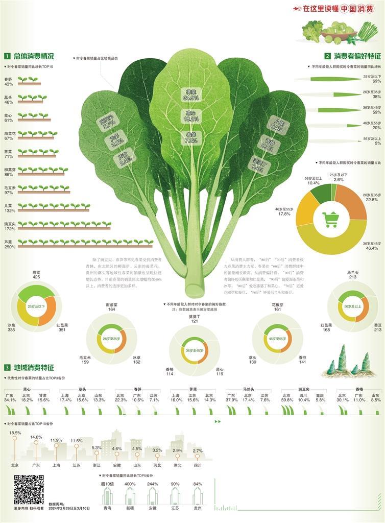 從地域消費(fèi)看,北京、廣東、上海、江蘇、浙江成為春菜消費(fèi)的主力省份,北京以18.5%的春菜銷(xiāo)量占比位居首位。隨著冷鏈、配送等物流基礎(chǔ)設(shè)施的不斷完善,過(guò)去只在局部地區(qū)售賣(mài)的春菜逐步突破地域限制,被全國(guó)各地的消費(fèi)者所購(gòu)買(mǎi),如折耳根在湖南、甘肅、黑龍江的銷(xiāo)量同比增長(zhǎng)均超100%,菜心在安徽、陜西、湖南的銷(xiāo)量同比增長(zhǎng)均超60%,春筍在寧夏、新疆、北京的銷(xiāo)量同比增長(zhǎng)均超40%。