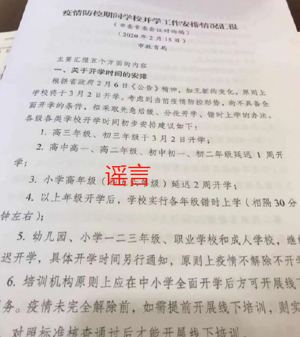 經(jīng)濟(jì)日?qǐng)?bào)-中國經(jīng)濟(jì)網(wǎng)2月19日訊 (記者朱國旺郭文培) 近日,一張名為“疫情防控期間學(xué)校開學(xué)工作安排情況匯報(bào)”的截圖在網(wǎng)上瘋傳。截圖顯示,這是一份學(xué)校開學(xué)安排情況的討論稿,對(duì)開學(xué)時(shí)間作了初步安排,并有如下表述:“根據(jù)省政府2月6日《公告》精神,如無新的變化,原則上學(xué)校將于3月2日開學(xué)?!?/span>