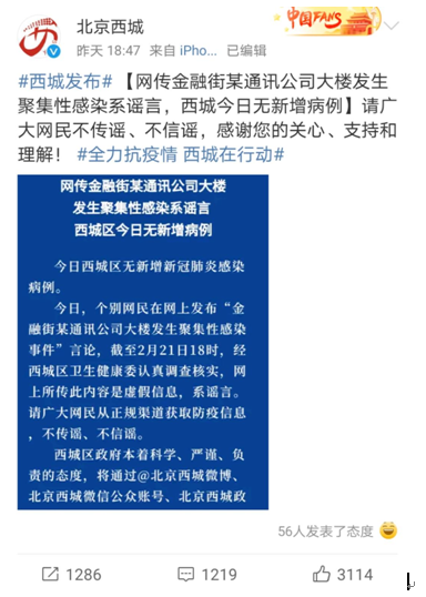 截至2月21日18時(shí),經(jīng)西城區(qū)衛(wèi)生健康委認(rèn)真調(diào)查核實(shí),網(wǎng)上“金融街某通訊公司大樓發(fā)生聚集性感染”是虛假信息,系謠言。請(qǐng)廣大網(wǎng)民從正規(guī)渠道獲取防疫信息。