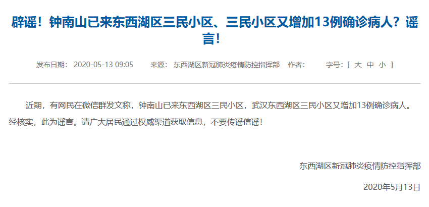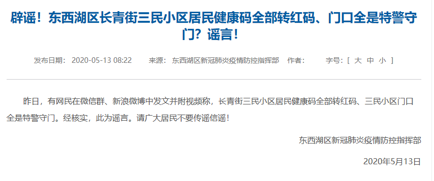 據(jù)武漢市東西湖區(qū)人民政府官網(wǎng)5月13日消息,經(jīng)核實(shí),網(wǎng)傳“鐘南山已來(lái)東西湖區(qū)三民小區(qū),武漢東西湖區(qū)三民小區(qū)又增加13例確診病人?!?“長(zhǎng)青街三民小區(qū)居民健康碼全部轉(zhuǎn)紅碼、三民小區(qū)門(mén)口全是特警守門(mén)”均系謠言。