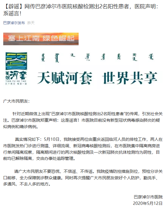 據(jù)巴彥淖爾市互聯(lián)網(wǎng)信息辦公室官微5月12日消息,針對(duì)近期微信上出現(xiàn)“巴彥淖爾市醫(yī)院核酸檢測(cè)出2名陽(yáng)性患者”的傳聞,巴彥淖爾市醫(yī)院鄭重聲明:這是謠言,巴彥淖爾市醫(yī)院目前沒(méi)有新型冠狀病毒感染肺炎的疑似病例和確診病例。