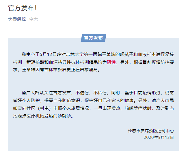 近日,有網(wǎng)傳稱(chēng)吉林大學(xué)第一醫(yī)院出現(xiàn)新冠病例。5月13日,長(zhǎng)春市疾病預(yù)防控制中心官微對(duì)此回應(yīng)稱(chēng),長(zhǎng)春市疾病預(yù)防控制中心于5月12日晚對(duì)吉林大學(xué)第一醫(yī)院王某姝的咽拭子和血液樣本進(jìn)行復(fù)核檢測(cè),新冠核酸和血清特異性抗體檢測(cè)結(jié)果均為陰性。另外,根據(jù)目前疫情防控要求,王某姝因有吉林市旅居史正在居家隔離。請(qǐng)廣大群眾關(guān)注官方發(fā)聲,不信謠,不傳謠。