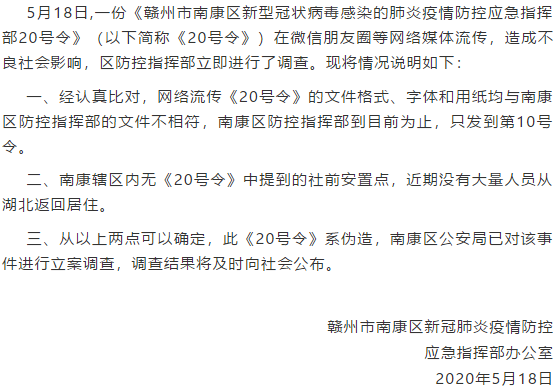 據(jù)中共贛州市南康區(qū)委宣傳部官微“南康發(fā)布”5月19日消息,贛州市南康區(qū)新冠肺炎疫情防控應(yīng)急指揮部辦公室稱,5月18日,一份《贛州市南康區(qū)新型冠狀病毒感染的肺炎疫情防控應(yīng)急指揮部20號(hào)令》(以下簡(jiǎn)稱《20號(hào)令》)在微信朋友圈等網(wǎng)絡(luò)媒體流傳,造成不良社會(huì)影響,南康區(qū)防控指揮部立即進(jìn)行了調(diào)查。現(xiàn)將情況說(shuō)明如下:
