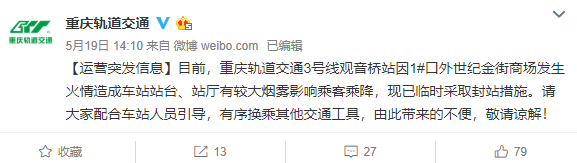 近日,有消息稱因出現(xiàn)疑似病例,重慶軌道交通3號(hào)線觀音橋站被封。對(duì)此,5月19日14時(shí),重慶市軌道交通(集團(tuán))有限公司@重慶軌道交通回應(yīng)稱,目前,重慶軌道交通3號(hào)線觀音橋站因1#口外世紀(jì)金街商場(chǎng)發(fā)生火情造成車站站臺(tái)、站廳有較大煙霧影響乘客乘降,現(xiàn)已臨時(shí)采取封站措施。????