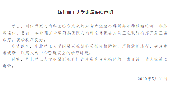 5月21日,華北理工大學(xué)附屬醫(yī)院發(fā)布聲明稱,近日,網(wǎng)傳“煤醫(yī)(現(xiàn)為華北理工大學(xué)附屬醫(yī)院)心內(nèi)科因哈爾濱來(lái)的患者發(fā)燒致全科隔離等待核酸檢測(cè)”一事純屬謠傳。目前,華北理工大學(xué)附屬醫(yī)院心內(nèi)科全體醫(yī)務(wù)人員正在緊張有序開(kāi)展正常診療,就診秩序良好。