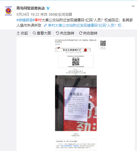 據(jù)半島都市報官微5月24日報道,針對“發(fā)現(xiàn)一名健康通行碼紅碼人員”一事,經(jīng)落實,系其家人操作失誤所致,該名人員實際持有綠碼,無健康問題。此外,5月24日,山東省青島市公安局網(wǎng)絡(luò)警察支隊官方微博也對此傳言進(jìn)行了辟謠。
