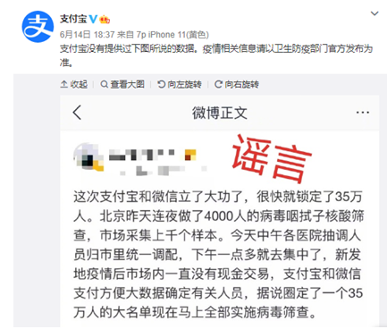 6月14日18時許,@支付寶對此回應(yīng)稱,支付寶沒有提供過下圖所說的數(shù)據(jù),疫情相關(guān)信息請以衛(wèi)生防疫部門官方發(fā)布為準(zhǔn)。隨后,@騰訊微信團(tuán)隊 也發(fā)布辟謠消息稱,微信并未提供過下圖提的數(shù)據(jù),請大家認(rèn)準(zhǔn)衛(wèi)生防疫部門官方信息發(fā)布渠道,勿信謠傳謠。