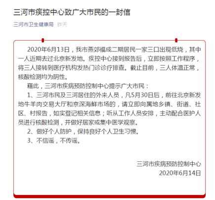 此外,針對三河市燕郊福成二期居民一家三口出現(xiàn)低燒,其中一人近期去過北京新發(fā)地一事,6月14日,三河市疾病預(yù)防控制中心對此做出回應(yīng)。三河市疾病預(yù)防控制中心表示,接到報告后,便立即按照工作程序,將三人接轉(zhuǎn)到醫(yī)療機(jī)構(gòu)發(fā)熱門診診療排查。截止目前(14日),三人體溫正常,核酸檢測均為陰性。