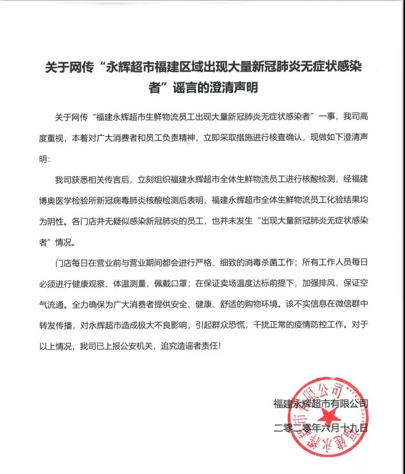 經(jīng)濟(jì)日報(bào)-中國經(jīng)濟(jì)網(wǎng)6月23日訊(記者朱國旺 郭文培) 6月19日,就“福建永輝超市生鮮物流員工出現(xiàn)大量新冠肺炎無癥狀感染者”一事,福建永輝超市有限公司聲明稱,獲悉相關(guān)傳言后,立刻組織福建永輝超市全體生鮮物流員工進(jìn)行核酸檢測,福建永輝超市全體生鮮物流員工化驗(yàn)結(jié)果均為陰性。各門店并無疑似感染新冠肺炎的員工,也并未發(fā)生“出現(xiàn)大量新冠肺炎無癥狀感染者”情況。