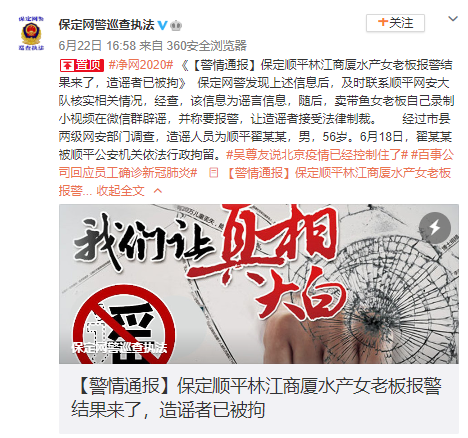 6月22日,保定市公安局網(wǎng)絡(luò)安全保衛(wèi)支隊(duì)發(fā)布警情通報(bào)稱,網(wǎng)傳“河北省保定市順平縣一帶魚老板店去北京新發(fā)地進(jìn)魚被隔離”等信息為謠言。經(jīng)過市縣兩級網(wǎng)安部門調(diào)查,造謠人翟某某已被順平公安機(jī)關(guān)依法行政拘留。