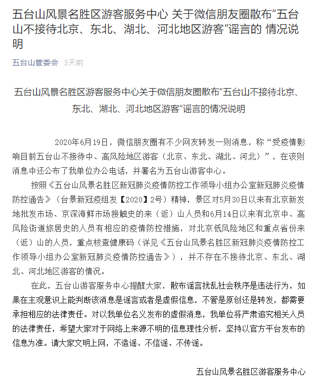 6月20日,五臺山風(fēng)景名勝區(qū)游客服務(wù)中心辟謠稱,“五臺山不接待北京、東北、湖北、河北地區(qū)游客”的說法為謠言。