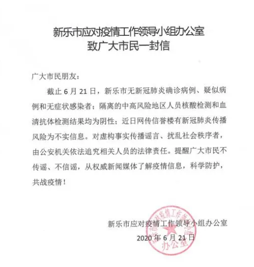 據(jù)河北省新樂市宣傳部官微21日消息,新樂市信譽(yù)樓有新冠肺炎傳播風(fēng)險(xiǎn)為不實(shí)信息。截止6月21日,新樂市無新冠肺炎確診病例、疑似病例和無癥狀感染者;隔離的中高風(fēng)險(xiǎn)地區(qū)人員核酸檢測和血清抗體檢測結(jié)果均為陰性。