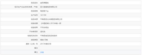 事實(shí)上,這并非四川逢春制藥有限公司首次出現(xiàn)藥品質(zhì)量缺陷。中國經(jīng)濟(jì)網(wǎng)記者查詢發(fā)現(xiàn),此前該公司生產(chǎn)的益母草顆粒就曾被通報不合格。