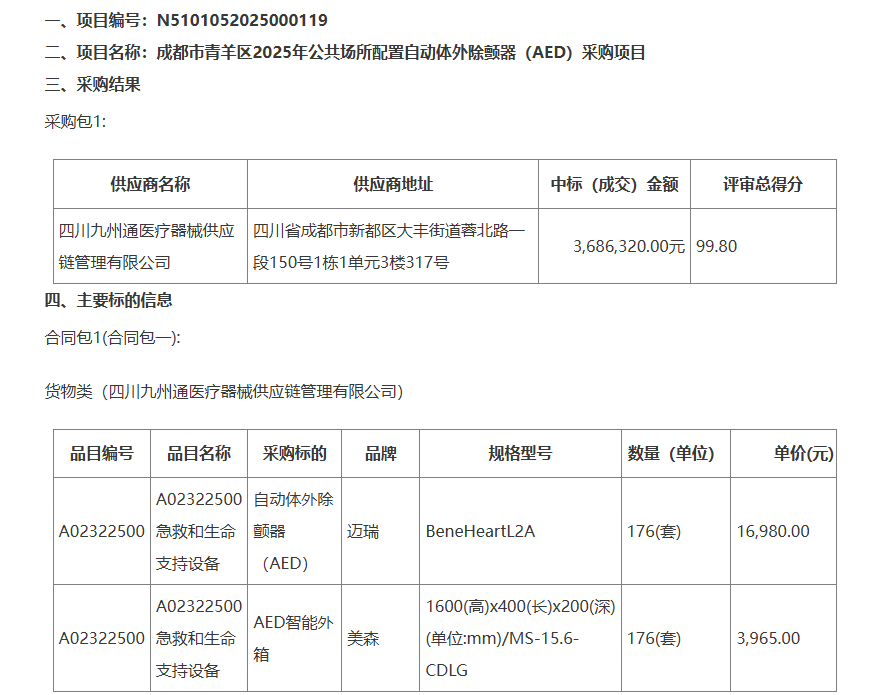 公告顯示,四川九州通醫(yī)療器械供應(yīng)鏈管理有限公司以99.80的評審總得分中標(biāo),中標(biāo)(成交)金額為3686320.00元,將供應(yīng)176(套)邁瑞公司的自動體外除顫器(AED),單價(jià)為16980.00元;供應(yīng)176(套)美森公司的AED智能外箱,單價(jià)為3965.00元。