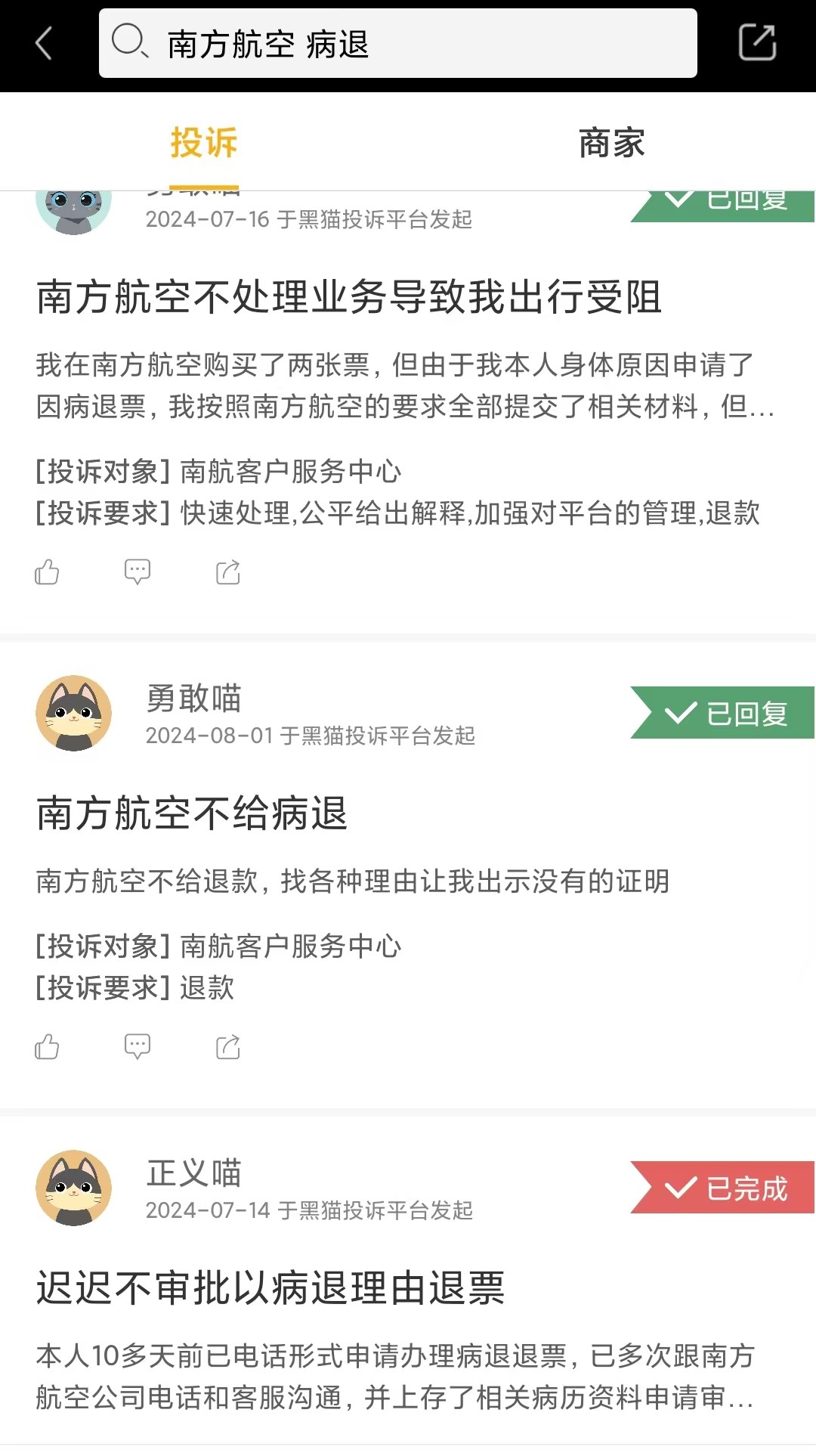 8月26日,記者在黑貓投訴平臺以“南方航空 病退”為關鍵詞搜索發(fā)現,共有272起相關投訴,反映的問題涉及審核慢、客服人員不專業(yè)、病退申請無法撤回修改等。