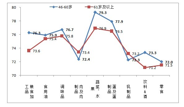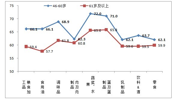 進一步分析46歲以上市民對食品安全現狀擔憂的食品領域,46-60歲市民對肉及肉制品、乳制品、飲料&酒和零食的安全信心指數評價較低,直接拉低他們目前對食品安全的放心程度。61歲以上市民目前對九大類食品的安全信心指數都偏低,除蔬菜水果和蛋及蛋制品外,其它食品的信心指數都低于65。