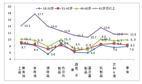 雖然年齡較大的市民對目前以及未來的食品安全信心比較不樂觀,但是他們對于九大類食品未來安全信心指數的增長抱有很大的期望,尤其是61歲以上的市民,其中他們對食用油、糧食加工品、調味品和乳制品的信心增長最為樂觀。