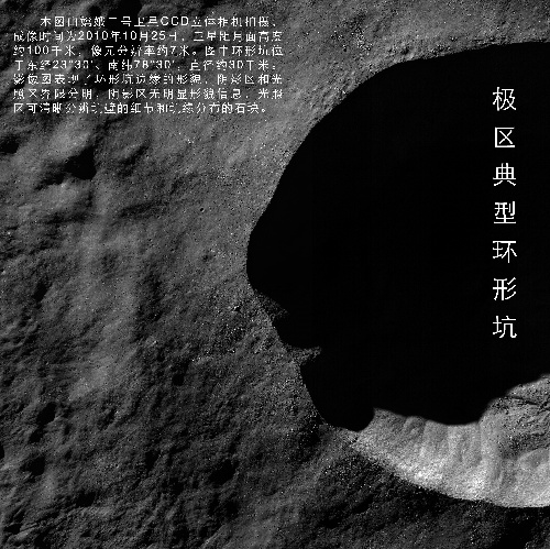 北京,2010年11月8日 國家國防科技工業(yè)局首次發(fā)布嫦娥二號月面虹灣局部影像圖 這是極區(qū)典型環(huán)形坑(成像時間為10月25日)。