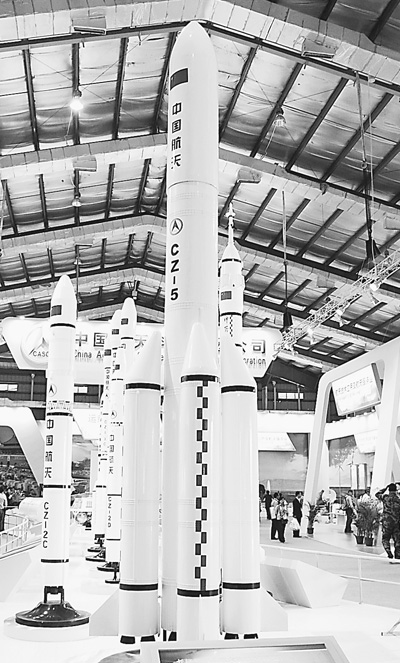 長征五號運載火箭模型。長征五號系列運載火箭是我國新一代大型運載火箭。以CZ—5E為例,其為兩級狀態(tài)火箭,芯級直徑5米,捆綁 4個3.35米直徑的助推器,起飛質(zhì)量856噸,計劃2014年實現(xiàn)首飛。CZ—5E火箭已初步被確定為用于月球表面采樣和返回任務(wù)用火箭。
