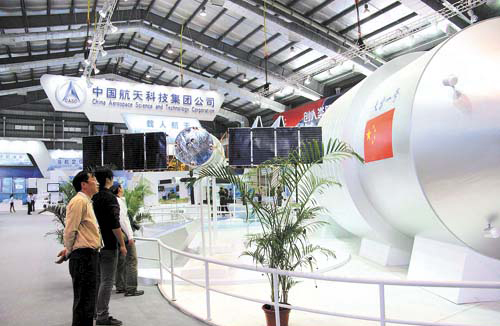 在第八屆中國(guó)國(guó)際航空航天博覽會(huì)中,中國(guó)航天科技集團(tuán)公司推出代表月球探測(cè)工程最新成果的“嫦娥二號(hào)”衛(wèi)星模型,代表“北斗導(dǎo)航”工程、直徑達(dá)7米、蔚為壯觀(guān)的天地一體衛(wèi)星運(yùn)行沙盤(pán),1:1的“天宮一號(hào)”目標(biāo)飛行器模型、新一代運(yùn)載火箭以及代表深空探測(cè)計(jì)劃的“螢火一號(hào)”衛(wèi)星模型等國(guó)家重大工程項(xiàng)目近100項(xiàng)新展品首次亮相。